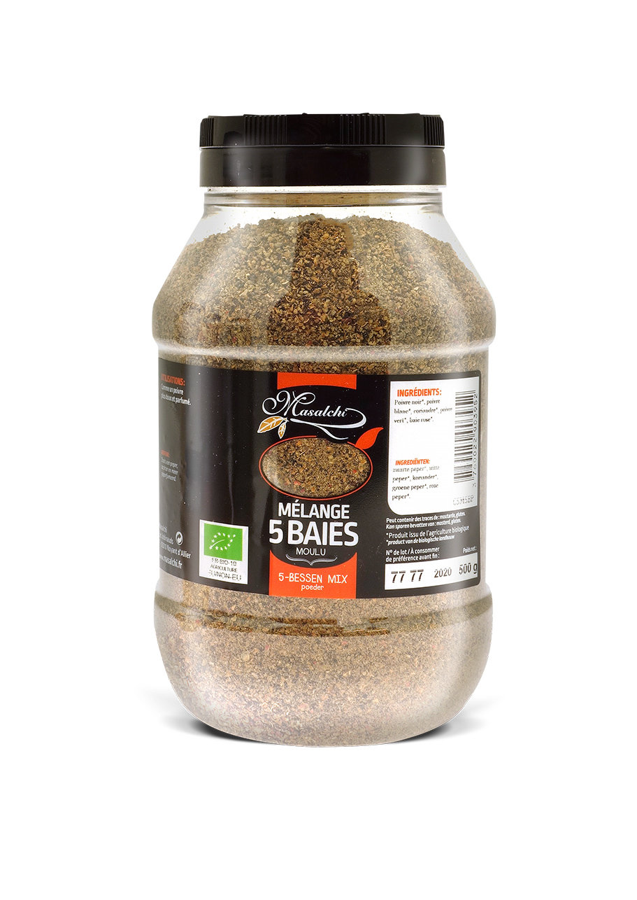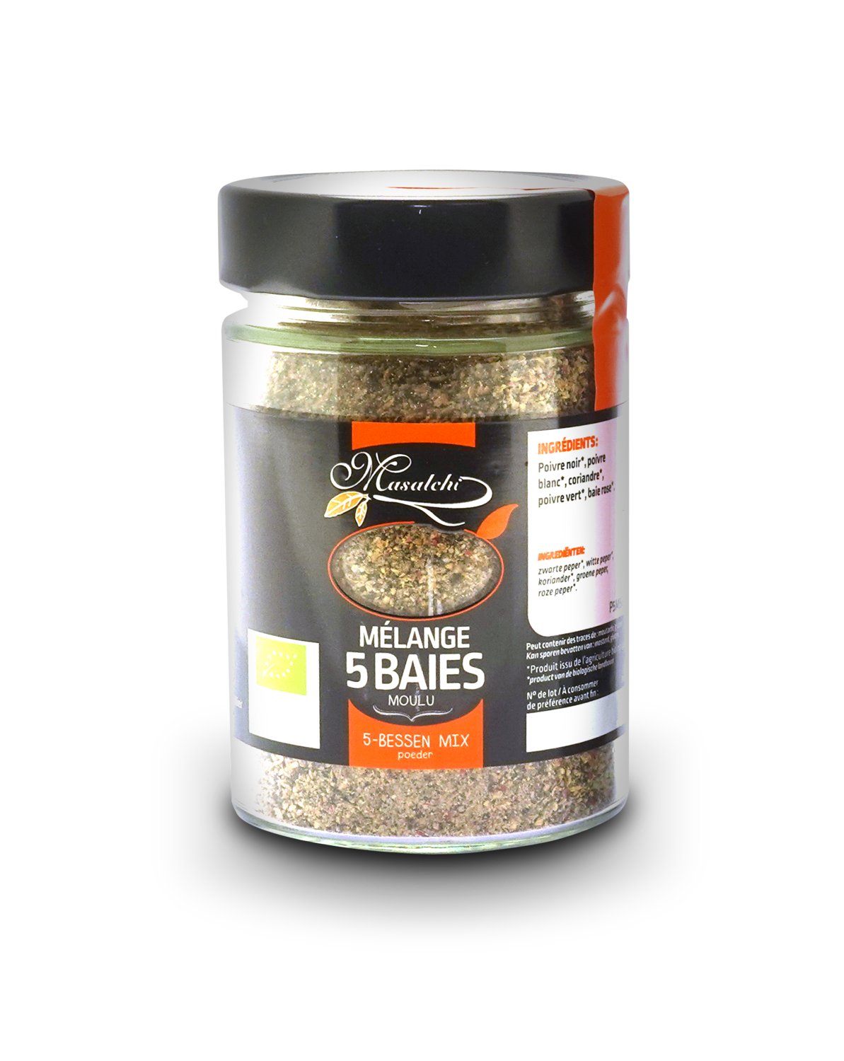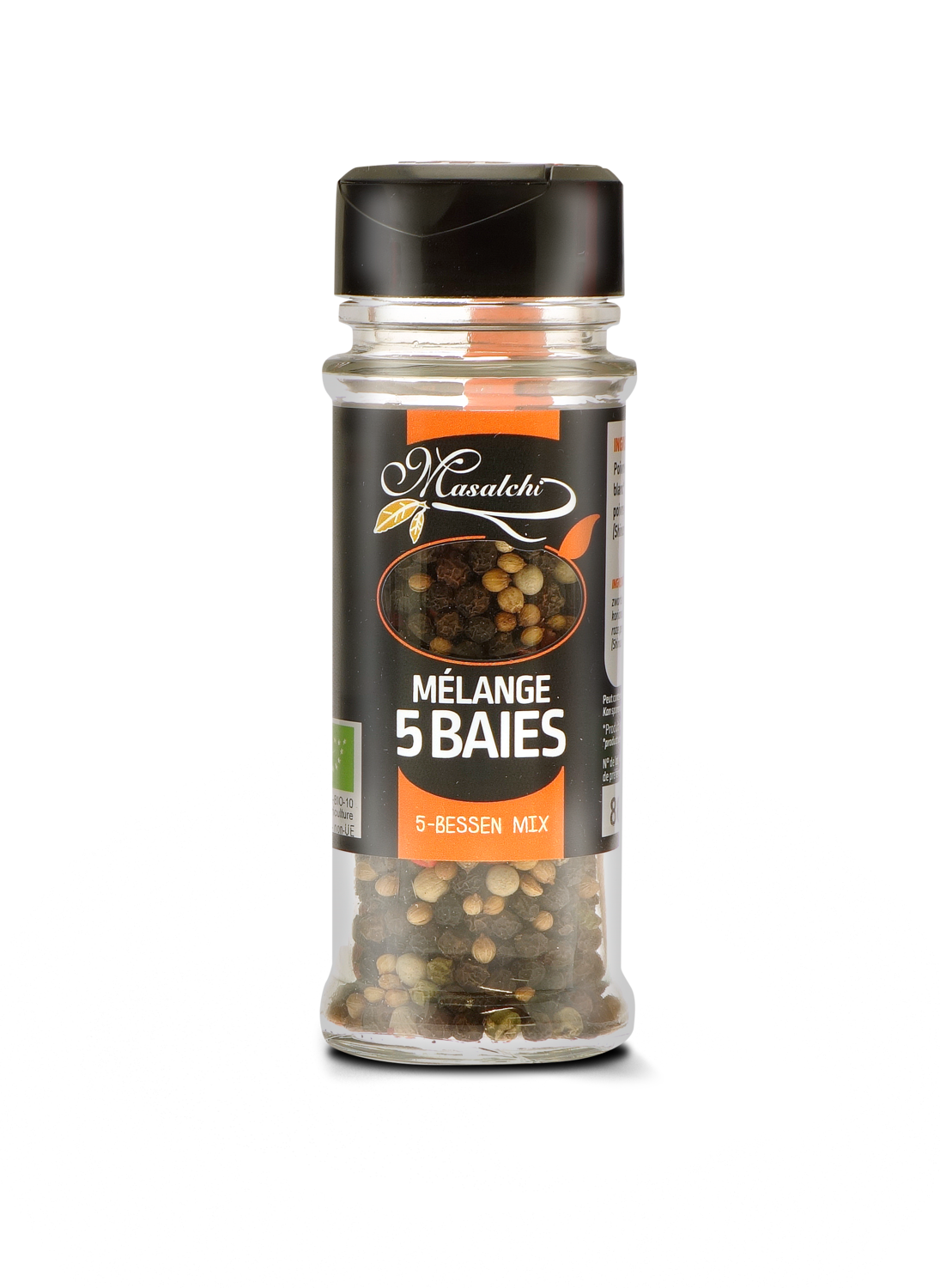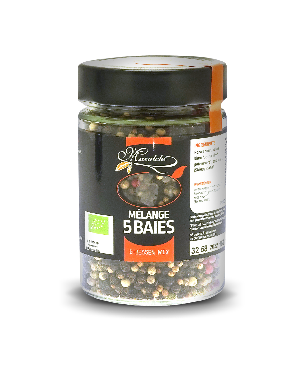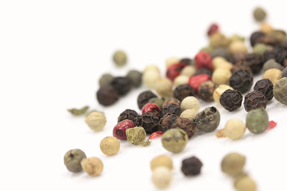 Poivre noir*, Poivre blanc*, Baie rose*, Poivre vert*, Coriandre*.